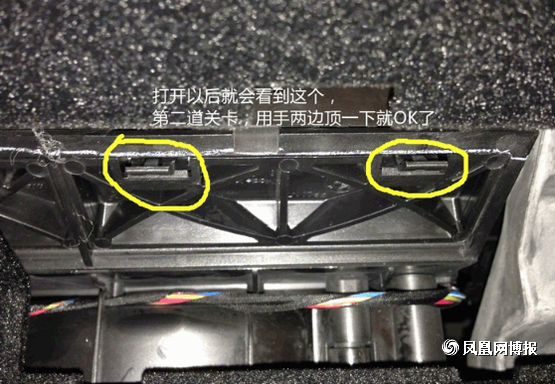 接下来我们再来拆接外部的空调滤芯, 美国在线世界杯 黄色标出的地方就是机关所在,圆圈的部分就只要用手指一捏就可以松掉提起,箭头部分是拔出来后的样子,所以童鞋们不用担心用力一拔就可以了。