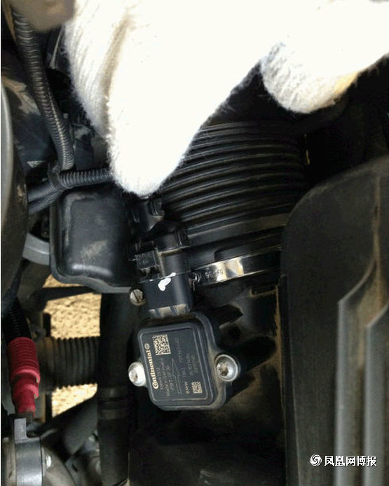 接下来就是要准备拆下空气滤芯了,第一次拆的童鞋要注意了,图中标出来的就是连接空气滤芯的接口,不要像我这样拽了半天也没拔出来,原来这上面有个小机关,有个凸起的小开关左手往下按的同时右手往后面拉,它就出来了。(另外,告诉大家,在经过行驶后停车的拆装的童鞋要等车子发动机冷却后再动手,不让带了手套,你还是会觉得旁边的发动机很烫,会不小心被烫到。)